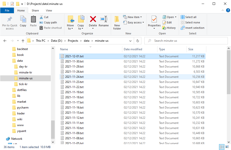 국내시장 주가정보는 100% 자동으로 취득하게끔 해놓은 반면, 미국시장은 아쉽게도 위와 같이 압축파일을 직접 받아와야 하는 수고로움이 있습니다. 그러나, 구글/야후 파이낸스 등을 통해 일자별 OHLCV 정도에 만족해야 했던 것에 비해 앞으로는 더욱 해상도 높은 데이터를 취득할 수 있게 되어 백테스트에 큰 도움이 될 것으로 기대됩니다.