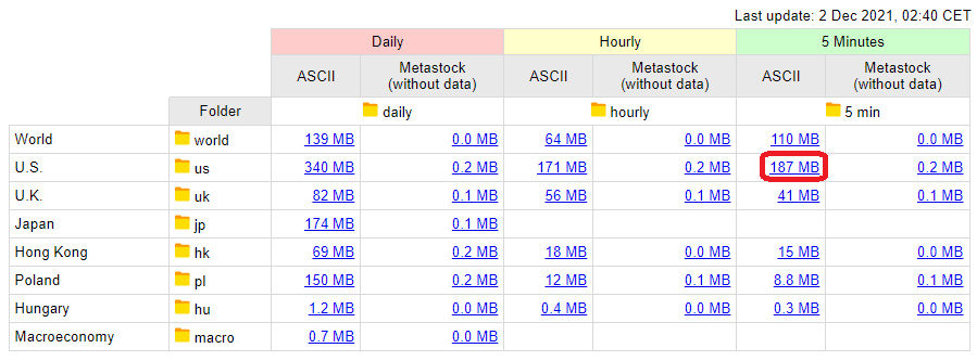 결론적으로, 폴란드의 stooq.com에서 5분 단위 데이터를 무료로 제공하고 있었습니다. 미국시장에 상장된 주식과 ETF의 최근 2달간 주가정보를 종목코드별로 모아서 ZIP 파일로 제공합니다. 아래 예시 화면의 우측 상단에 187 MB로 표시된 부분에 상응하는 링크를 누르면 받을 수 있습니다.