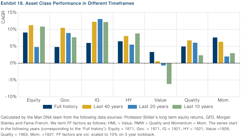 아래의 그래프는 각 자산별로 과거 실적을 10년 단위로 끊어서 표시한 것이며, 더 아래의 그래프는 과거 다섯 차례의 역사적인 인플레이션 시기에 각 자산별 실적을 표시한 그래프입니다. 앞서 언급한 바와 같이, 인플레이션 시기에 가치주의 활약이 상대적으로 두드러져 보입니다.