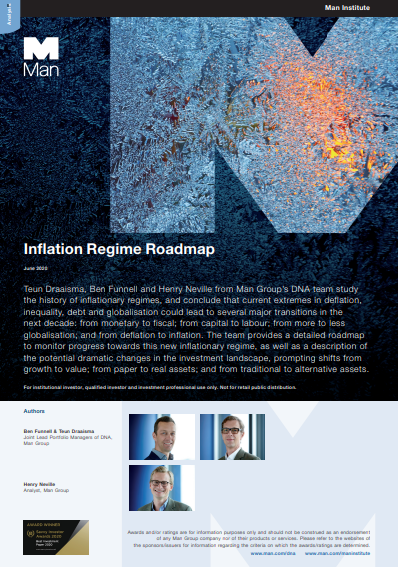 그러다 우연히 영국의 헤지펀드인 Man Group에서 지낸해 발간한 Inflation Regime Roadmap 보고서를 접했습니다. A4 30장 분량의 이 보고서는 영국과 미국의 역사적인 배경을 바탕으로 최근의 주식-채권간 상관관계, 통화정책과 재정정책의 변화를 감지해 우리가 어느 단계에 머무르고 있는지 판단하는 방법을 설명하고, 인플레이션이 시작되면 어떠한 자산으로 포트폴리오를 구성해야 하는지에 대해 설명하고 있습니다.