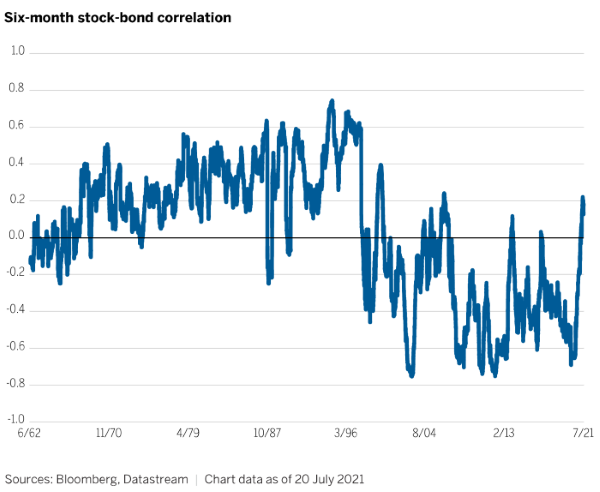 그 이유는, 최근 주식-채권간 상관관계에 커다란 변화가 관측되고 있기 때문입니다. 그동안 주식 60%, 채권 40% 비율로 포트폴리오를 구성해 주식의 높은 변동성을 상쇄하거나 한쪽의 손실을 보전하곤 했죠. 그러나 아래와 같이 주식-채권간 상관관계가 양(+)의 관계로 전환될 경우, 변동성 감쇄나 손실보전 효과가 없어집니다. 특히 명목채권의 경우 인플레이션 억제를 위한 기준금리 상승시 채권가격 하락에 따른 자산손실까지 초래하게 됩니다.