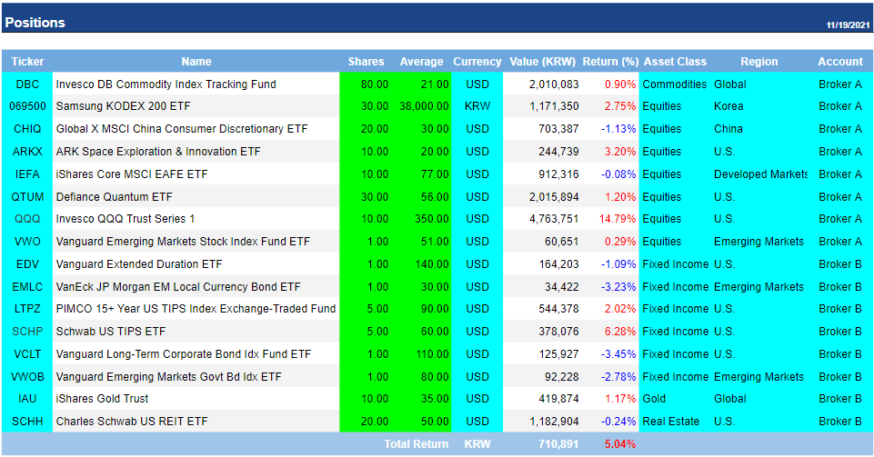 이러한 관점에서, 수시로 다수의 증권사 앱을 열어보지 않더라도 보유한 모든 종목들의 손익을 종합해 주기적으로 살펴보고, 혹시 리밸런싱이 필요한 시점은 아닌지를 월 1회 정도는 점검하고 싶었습니다. 이러한 목적에서 이 스프레드시트가 제공하는 정서적인 측면과 전략적인 측면의 강점은 매우 크다고 생각합니다.