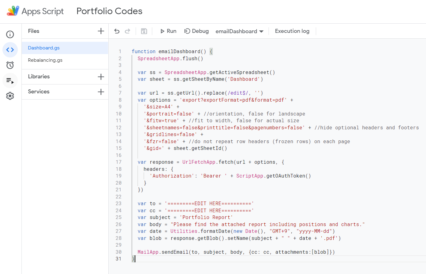 Dashboard 시트와 Rebalancing 시트를 PDF로 만들어 이메일로 발송하는 함수를 각각의 동명 .gs 파일에 정의했고, 23행과 24행의 수신자 이메일 주소(to), 참조자 이메일 주소(cc)를 수정 후 Run을 눌러 테스트해볼 수 있습니다. 이 스프레드시트에서 처음으로 이메일을 발송하기 때문에 권한을 요청하는 다이얼로그가 뜰텐데, 승인하면 됩니다.